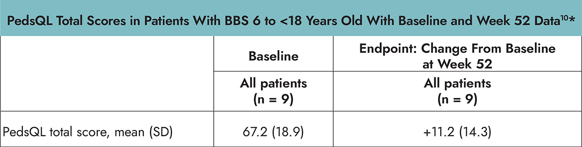 In the Phase 3 trial in patients 6 years and older with BBS, PedsQL and IWQOL-Lite were assessed as exploratory endpoints and were not powered for formal statistical testing or significance. Change from baseline after approximately 52 weeks of treatment was measured by the age-specific PedsQL or IWQOL-Lite assessments.10